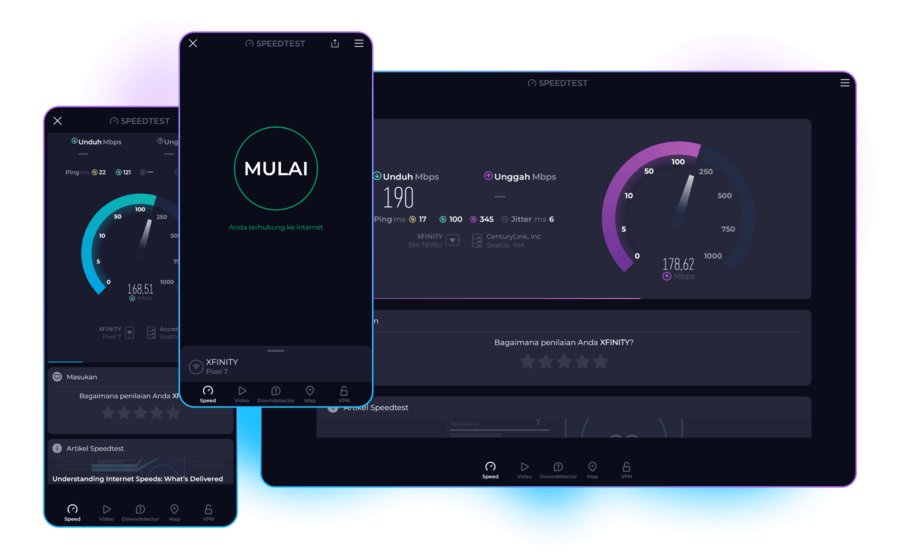 Kami di Speedtest by Ookla® memiliki misi untuk menjadikan internet lebih cepat dengan menyediakan data dan analisis tentang kecepatan internet di dunia nyata. Dengan miliaran pengujian secara global, kami hadir di tempat Anda berada untuk perangkat yang paling sering Anda gunakan.